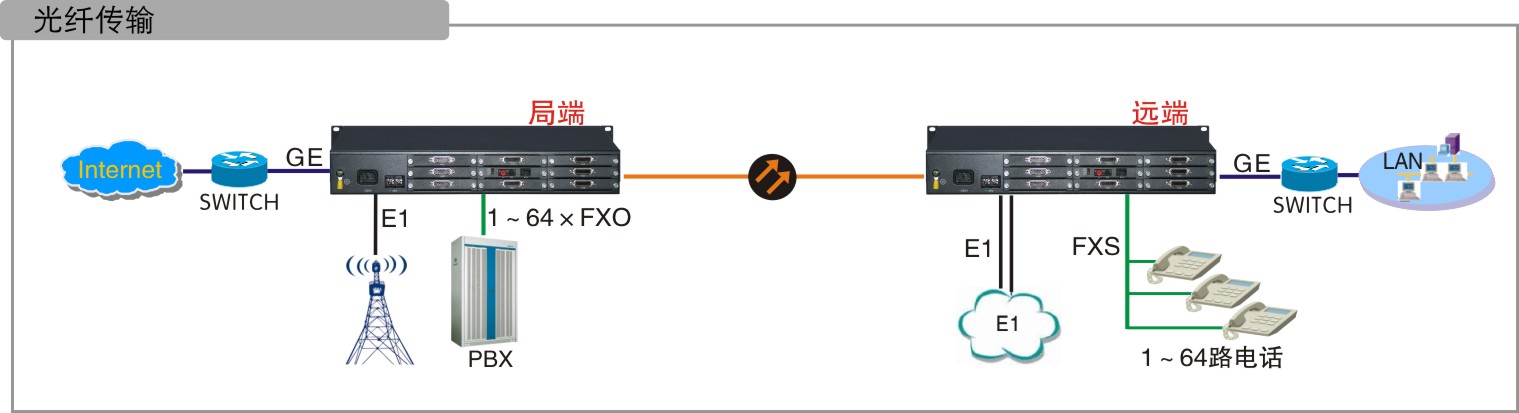 選擇E1通道傳輸時,任意1個E1可以傳輸64路語音